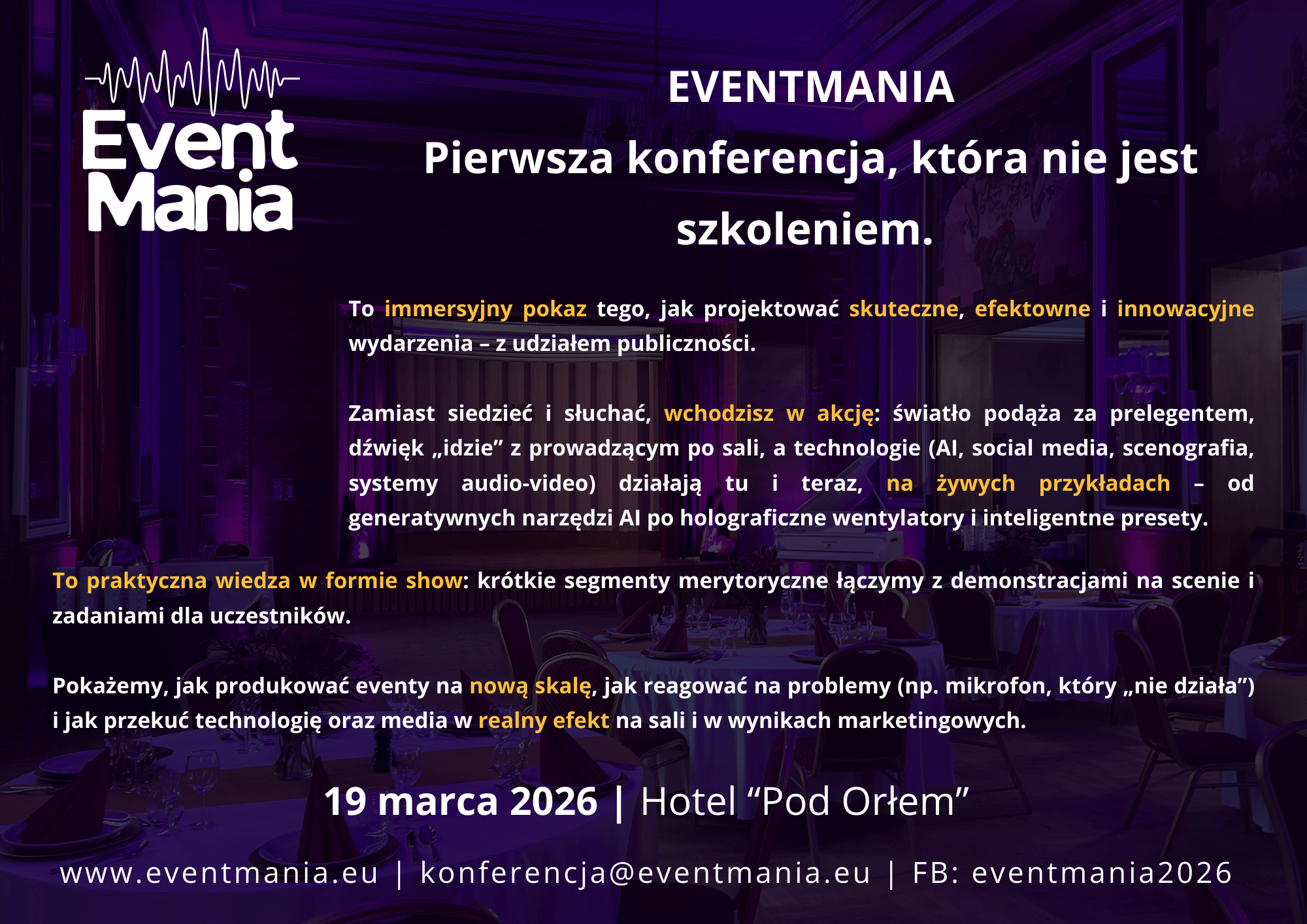 EVENTMANIA to dzień, w którym teoria zamienia się w działanie. Spotkanie marketerów, event managerów i producentów, gdzie prelekcje łączą się z pokazami na żywo: dźwięk, światło, wideo i AI.